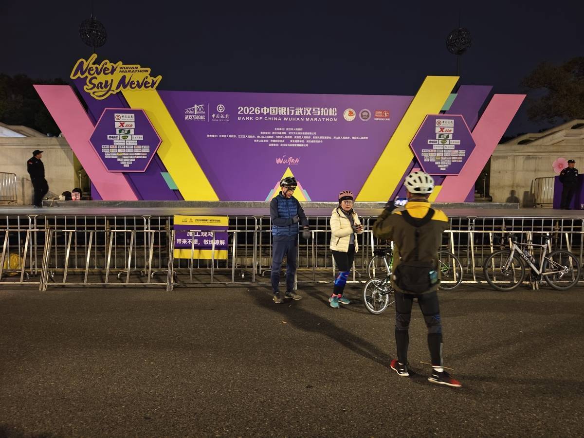 3月21日晚,武汉沿江大道三阳路口,市民在已经搭建好的武汉马拉松起点舞台旁拍照。(湖北日报全媒记者 柯皓 摄)