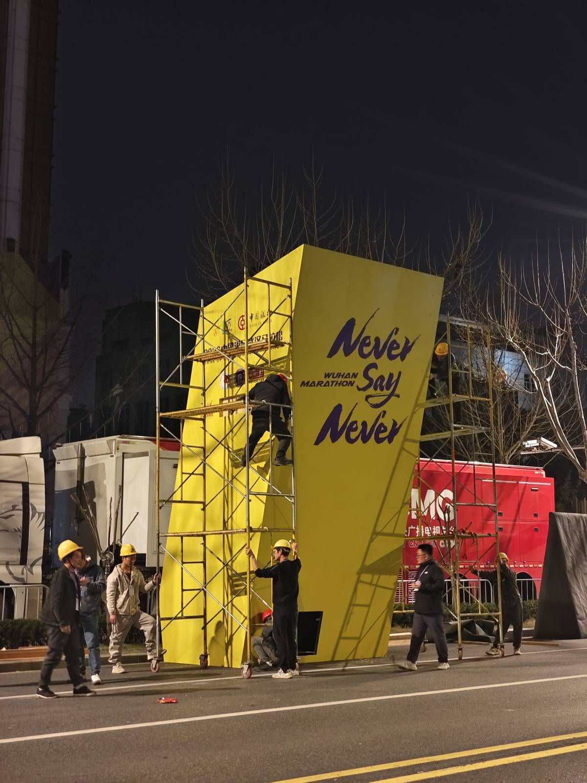 3月21日晚,武汉沿江大道三阳路口,施工人员在安装武汉马拉松起跑拱门。(湖北日报全媒记者 柯皓 摄)