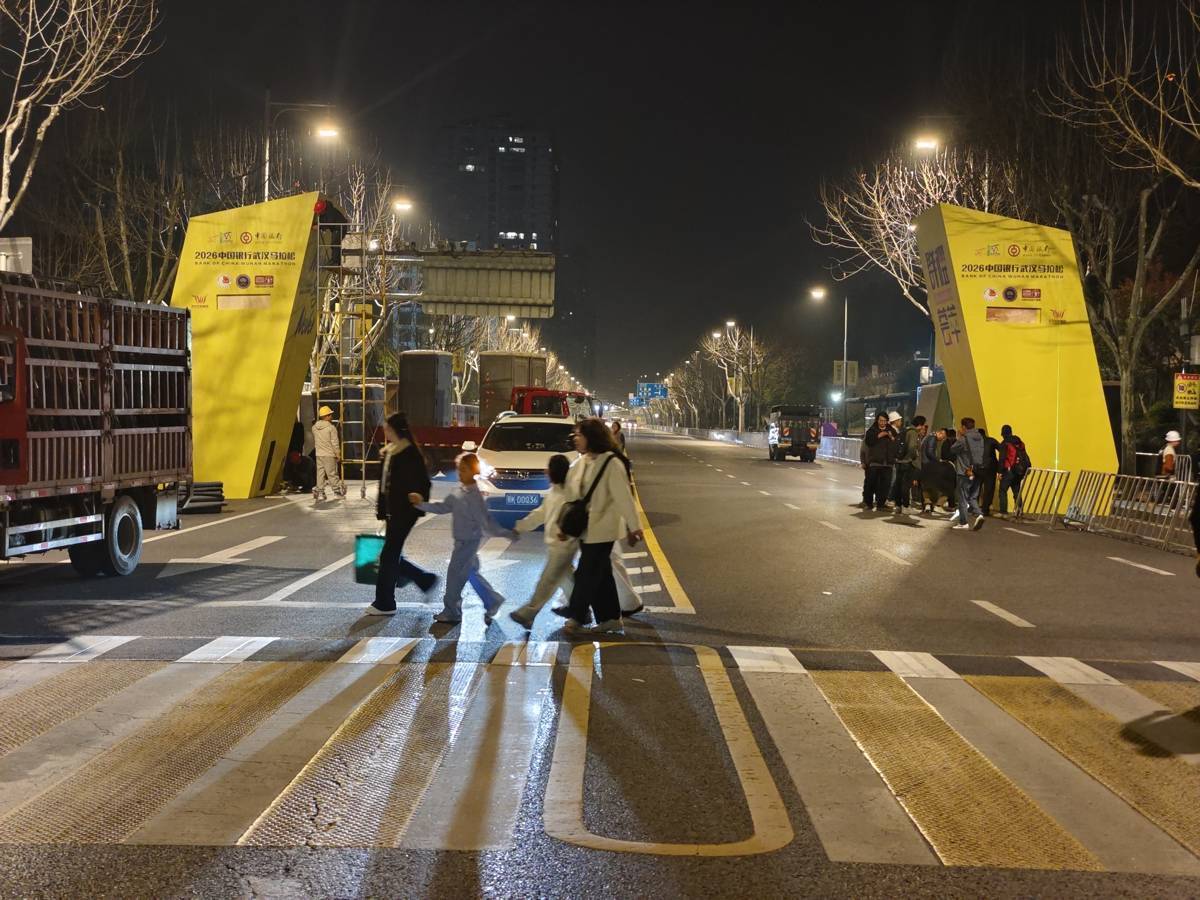 3月21日晚23时许,武汉沿江大道三阳路口周边已实施交通管制,工作人员连夜搭建起跑拱门、安装发令设备与道路护栏。沿江大道安检设施、安保力量陆续到位。夜色中,城市为一场盛大奔跑做着最后准备,静待明天鸣枪开跑。(湖北日报全媒记者 柯皓 摄)